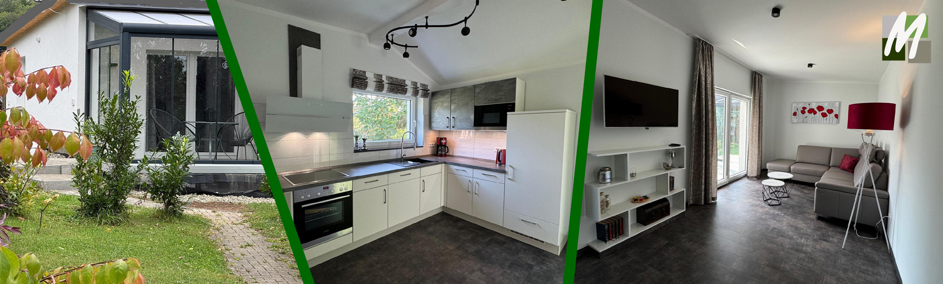 Ferienhaus für 2 Personen, 55 qm, barrierearm, offener Wohn-/Essbereich, ebenerdige Dusche, Wintergarten, separater Zugang, PKW-Stellplatz, Boxspringbett.